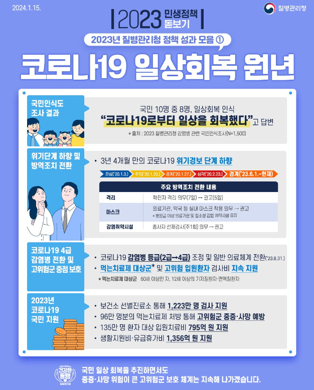 2024년이 시작된 이 시점에서도 그 조치는 변함없습니다. 코로나19에 감염이 병원이나 보건소 등 기관에서, 확인된 사람은 보건소에서 문자가 오게 되어있고, 그 문자를 통보받은 시점부터 5일간 자가격리 및 치료기간을 갖습니다. 그리고 이는 말씀드렸다시피 권고사항에 해당합니다.