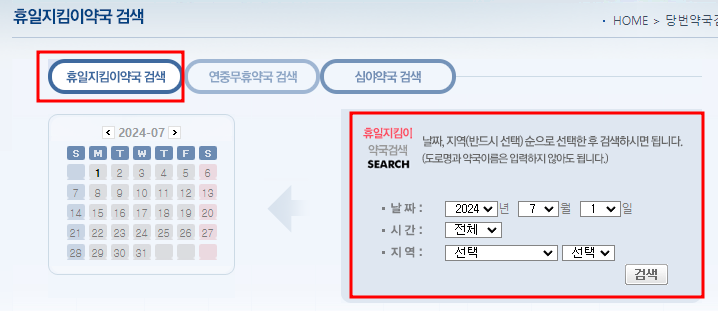 여기서 최상단 왼쪽에 위치한 휴일지킴이약국검색을 클릭해서 들어가 주시면 아래와 같은 화면이 뜨고 3가지 검색 메뉴가 나오게 됩니다.