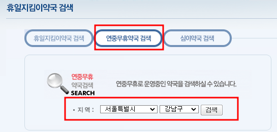 휴일지킴이 약국 검색을 하였을때 연중무휴 약국이 많지 않았습니다. 물론 지역마다 다르기는 하겠지만, 서울 강남 인근으로 검색을 해보았을 때에도 한 두 군데 정도 되는 곳들이 많았기 때문에 한번 검색해서 알아놓게 되면 따로 저장해 놓거나 기억해 두고 그다음에는 급할 때 바로 갈 수 있지 않을까 생각합니다.